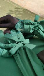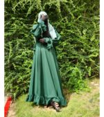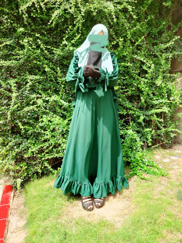Indulge in refined elegance with our Ruffle Abaya, crafted from luxurious lightweight fabric that flows effortlessly with every movement. The sophisticated emerald hue is complemented by delicate ruffle accents along the hem and cuffs, while the adjustable tie sleeves add a bespoke finishing touch.